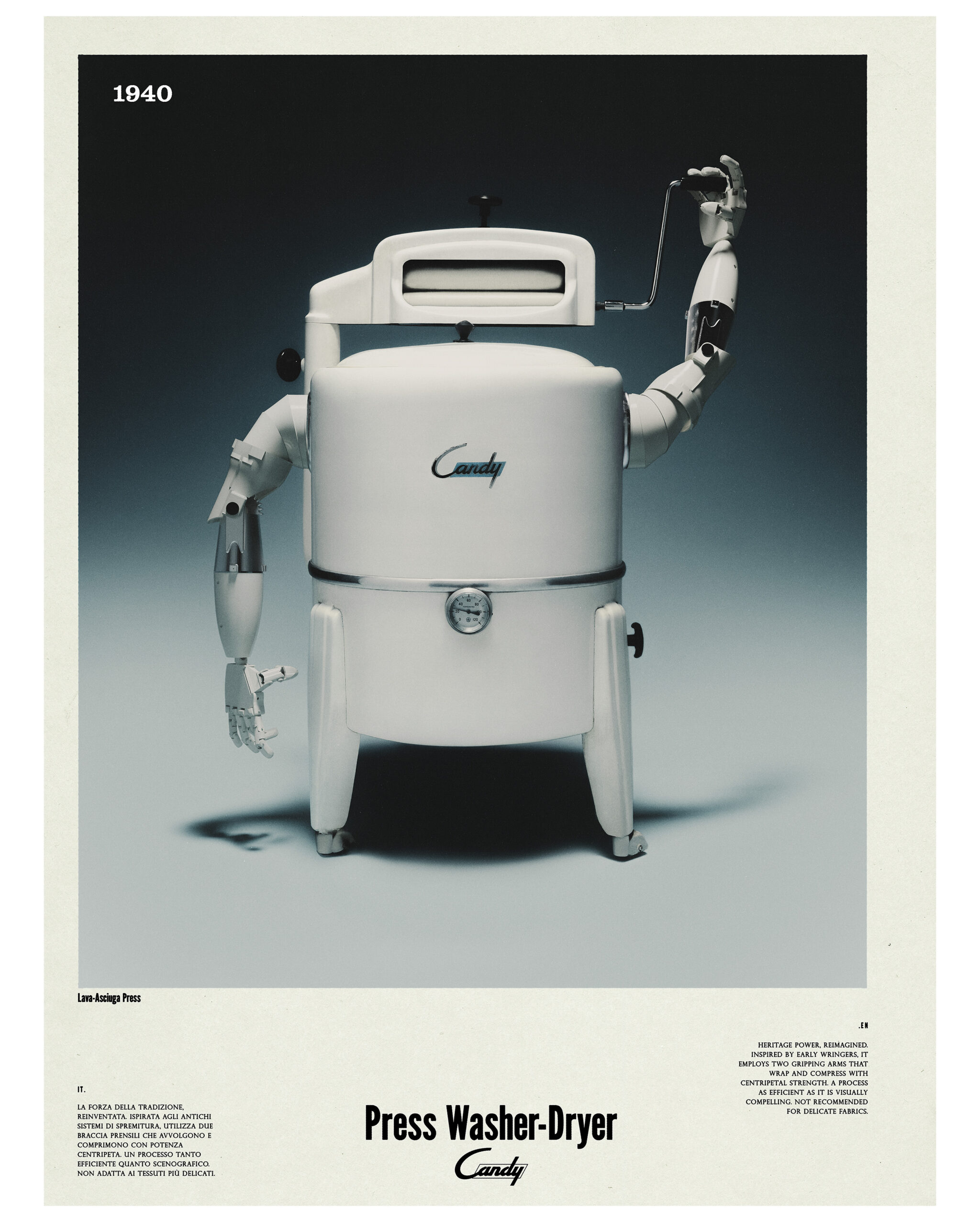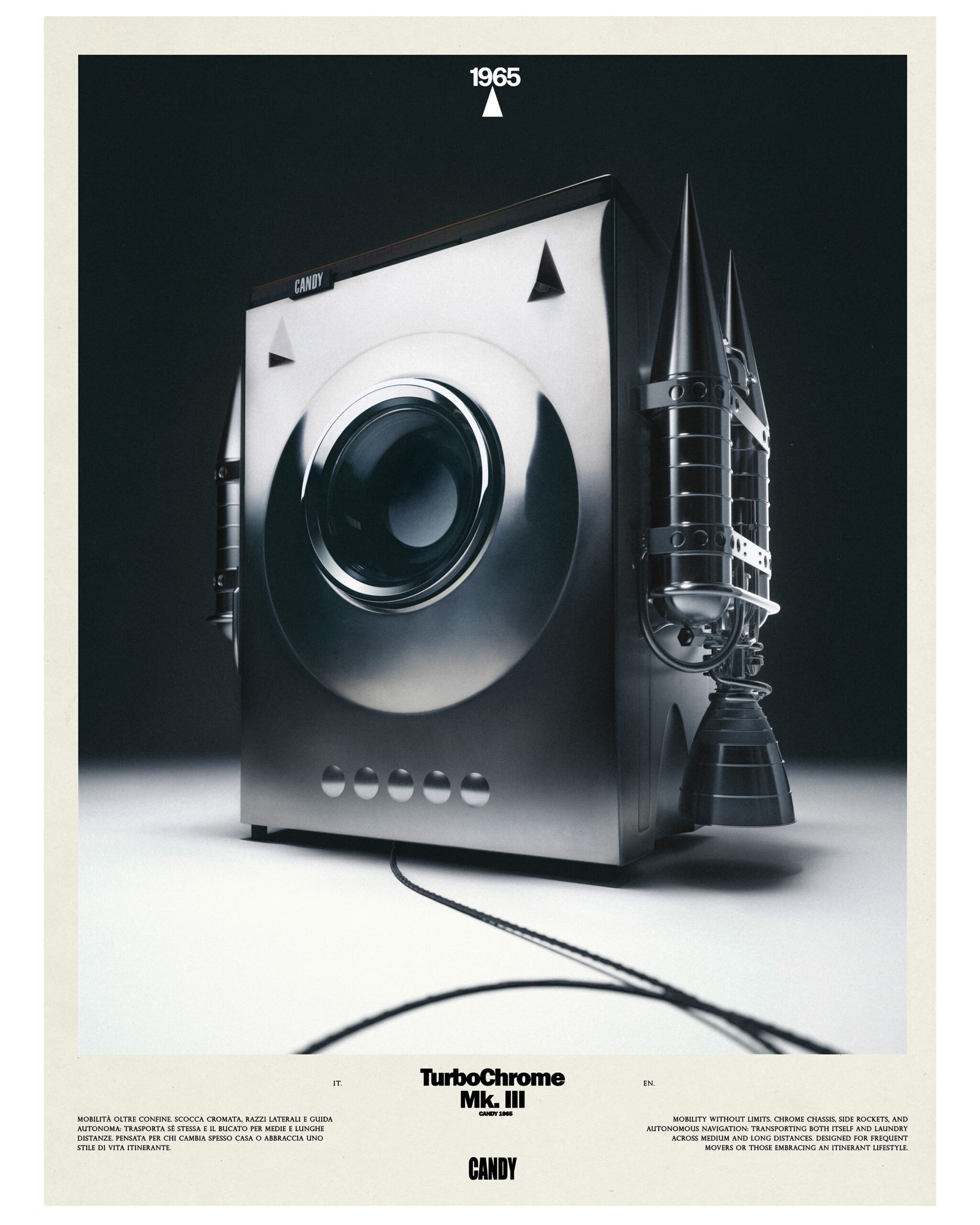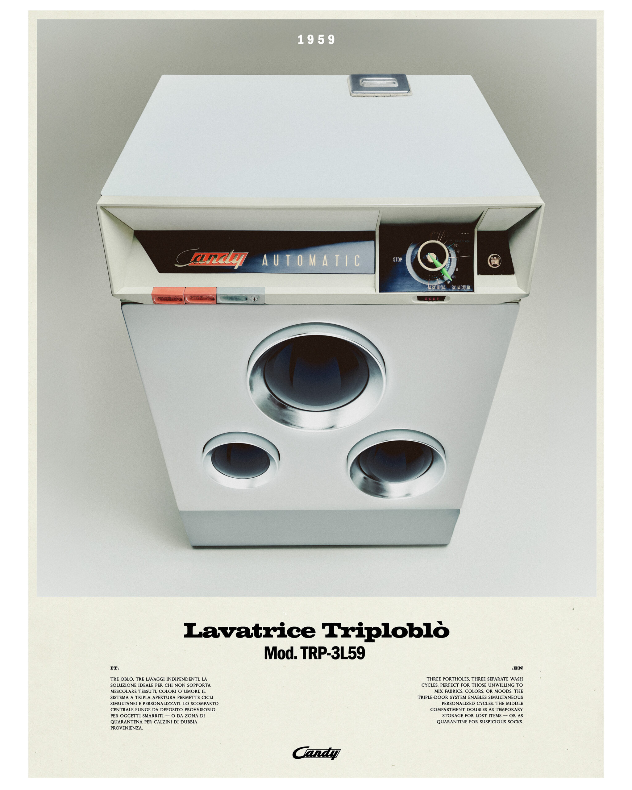 The project investigates the Candy appliances legacy of visionary design and technological imagination, drawing from prototypes, patents, and inventions that anticipated new ways of living. This visual and spatial journey reflects on how objects once conceived as futuristic can still inspire today’s dialogue between industry, design, and culture. Curatorship by Andrea Tinterri; 3D Modeling and Graphic Design by Subject Verb; Post Production by Futura Post; Light design by Teo Zanin; Exhibition Design by Studio Gisto; Project Coordination by Chiara Suardi; Communication by Cliniq Brand Surgery